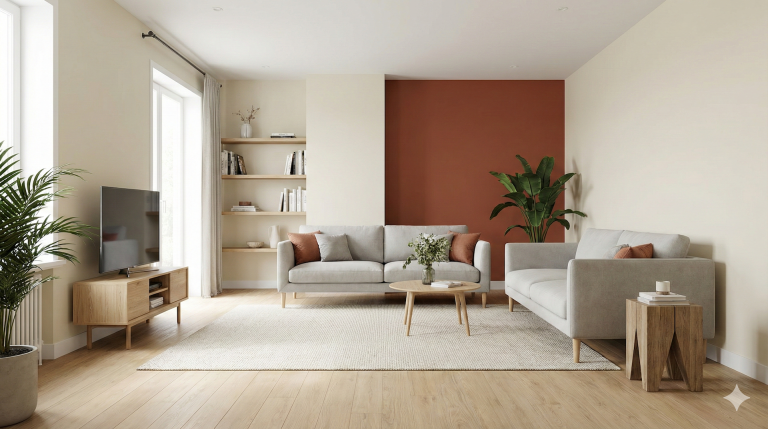 - Eine einzelne Akzentwand lenkt den Blick und gibt dem Raum einen Mittelpunkt.