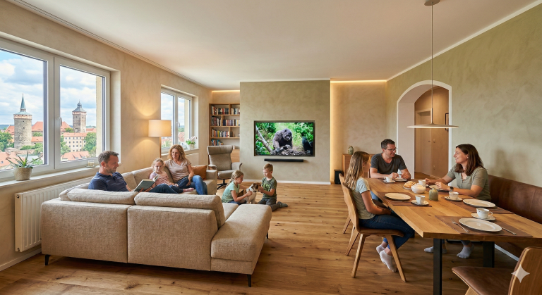 Das Wohnzimmer ist der Mittelpunkt der Wohnung: Hier wird entspannt, ferngesehen, gelesen, mit Familie und Freunden zusammengesessen. Damit es sich wirklich gut anfühlt, sollten Farben, Boden, Möbel und Beleuchtung ein ruhiges, aufgeräumtes Bild ergeben und zum Alltag der Bewohner passen